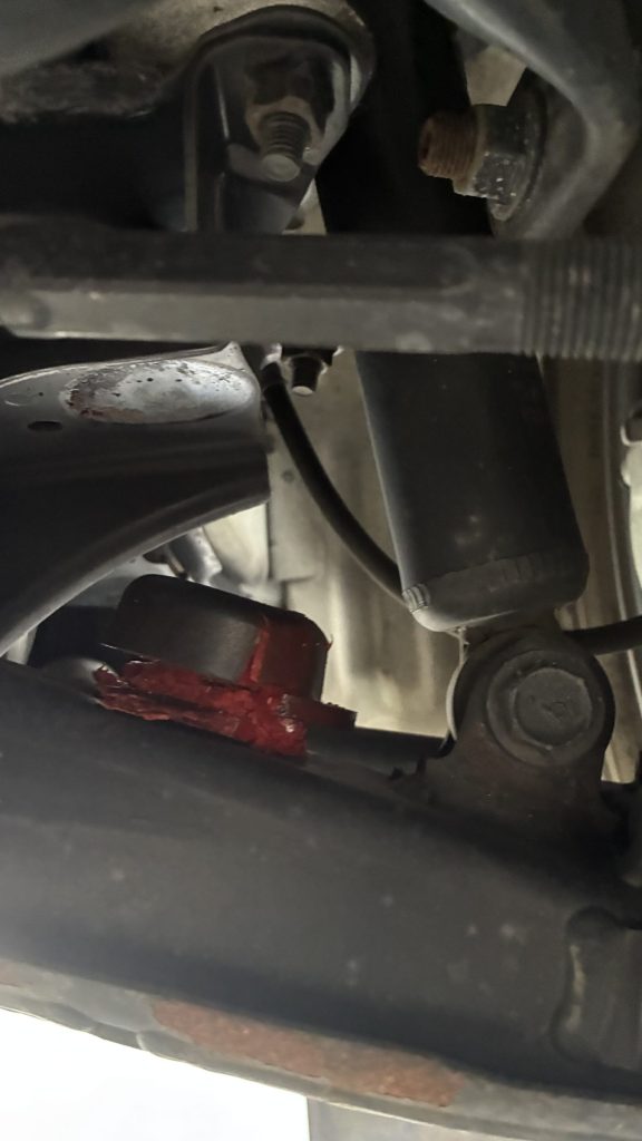 車がバウンドした時の底付きを防ぐ部品が玉砕して「ショック」は左右で硬さが大きく違っていました。