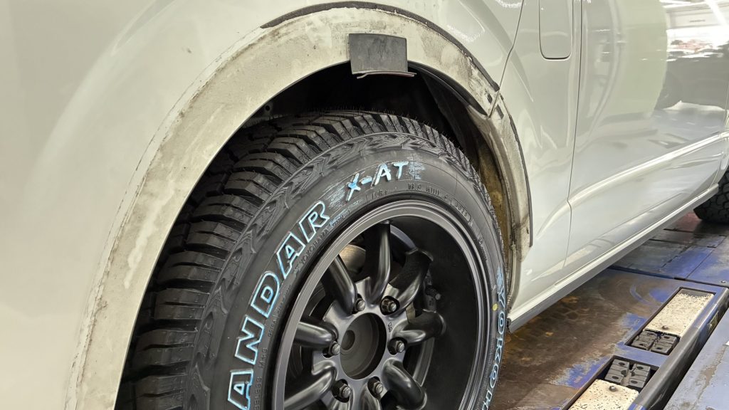 こちらの車はオーバーフェンダーを装着した車両ですが、年数が経つと割れがあったり、テープの劣化もありぐらついている場合も多いです。