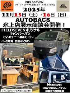 2025.11.12 AUTOBACS氷上店にて車両展示商談会開催 11/15-16 2日間!! 皆様こんにちは。 FIELDSEVEN明石店の宮崎です。 本日はイベントのご案内です。 オートバックス氷上店で車両展示商談会を開催致します。 お近くにお越しの際は是非お立ち寄りくださいませ。