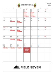 2025.12.23 【お知らせ】1月『店休日』のお知らせ いつもFIELD SEVENをご利用いただき誠にありがとうございます。 本年もよろしくお願い致します。 1月の店休日のご連絡です。 下記カレンダーをご確認ください。 29日に『棚卸』の予定でございます。 営業については各店までお問合せくださいませ。