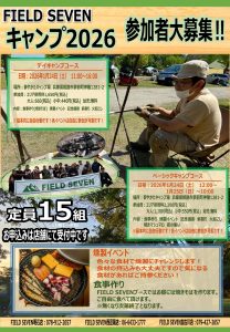 2025.12.28 【 イベント 】1月 FIELD SEVEN Camp Meets のご案内! ◆ Let’s Go FIELD SEVEN CAMP MEETs 兵庫エリア◆ 2026年1月 ” FIELD SEVEN Camp Meets ” の募集です! ●日程:1月24日(土)~25日(日) ≪場所:夢やかたキャンプ場≫ ●デイキャンプコース 日程:1月24日(土) 11:00~16:00 デイキャンプでのご参加も可能となっております! ” 宿泊はハードルが高い ”そんな方へおすすめです! テントや寝袋は不要! 椅子とテーブルと調理器具があれば一通り楽しめちゃいます! なんでもサポートするのでお気軽にご参加・お問合せください! 焚き火して、アウトドア飯を食べる、のんびり椅子に座って自然を感じる。 過ごし方は自由です! 自由参加のワークショップも開催するので、是非ご参加ください! ご予約はお近くの店舗へお越しくださいませ⛺ 皆様のご応募お待ちしております。 FIELD SEVEN