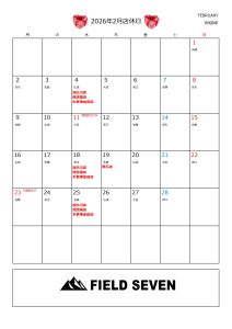 2026.01.31 【お知らせ】2月『店休日』のお知らせ いつもFIELD SEVENをご利用いただき誠にありがとうございます。 2月の店休日のご連絡です。 下記カレンダーをご確認の上ご来店ください。