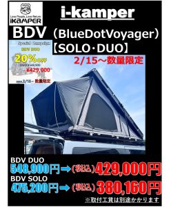 2026.02.05 i-kamperキャンペーンのご案内 皆様こんにちは。 FIELDSEVEN明石店の宮崎です。 本日はi-kamperキャンペーンのご案内です。 対象機種はBlue Dot Voyager(BDV) BDV DUO BDV SOLO が対象となります。 キャンペーン期間は2/15(日)~数量限定です。 FIELDSEVEN全店で開催しております。お近くのFIELDSEVENへお越しくださいませ。 事前予約も承り中です。お気軽にお声掛けくださいませ。 皆様のご来店をSTAFF一同心よりお待ちしております。
